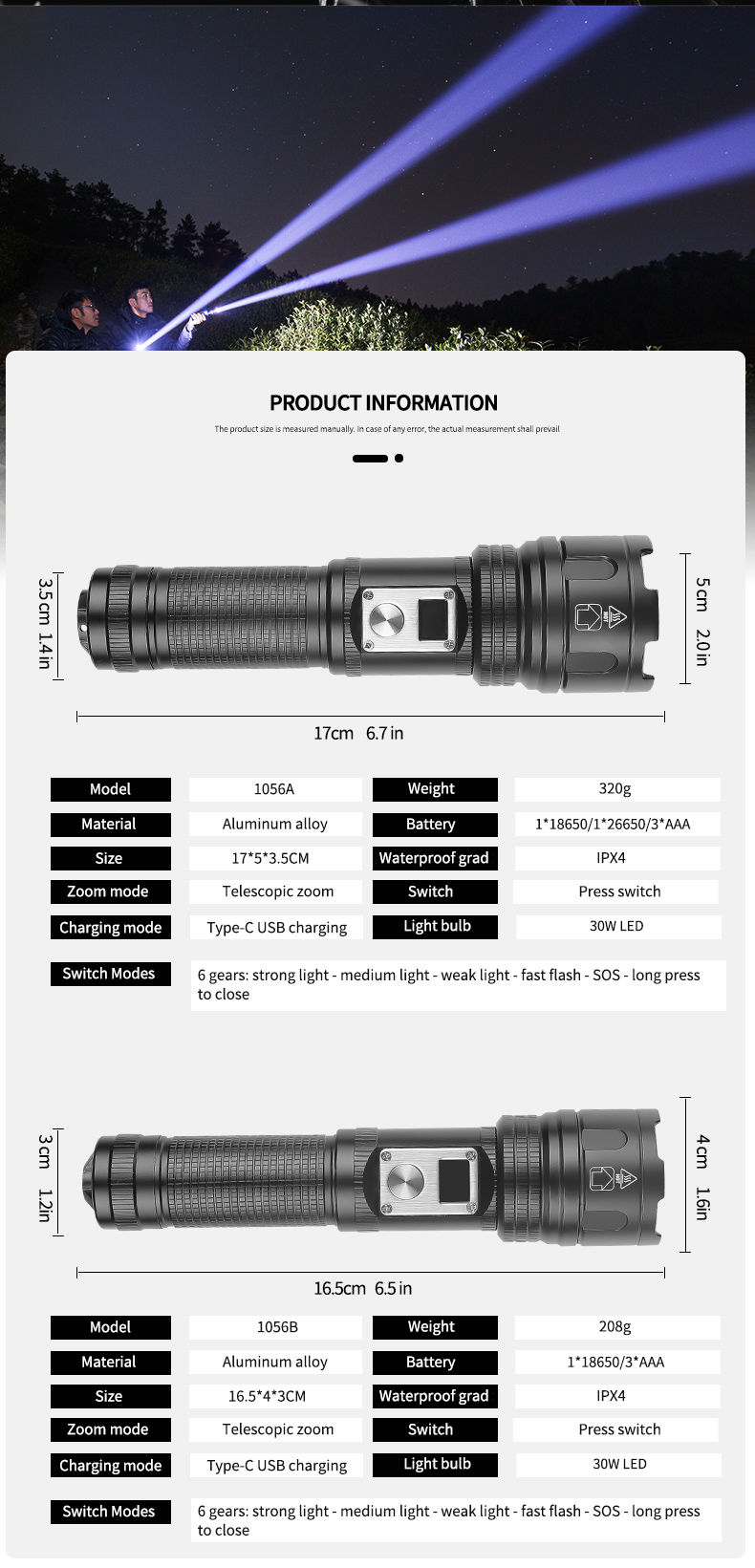 Strong Light – Medium Light – Weak Light – Fast Flash – SOS – Long Press to Close