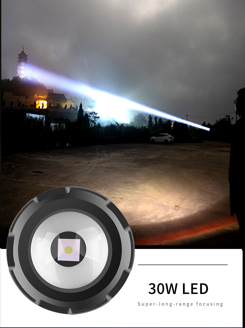 30W LED Long-Range Throwing LED Flashlight Digital Power Display Strong USB Rechargeable Aluminum Alloy Torch Light Type Type A