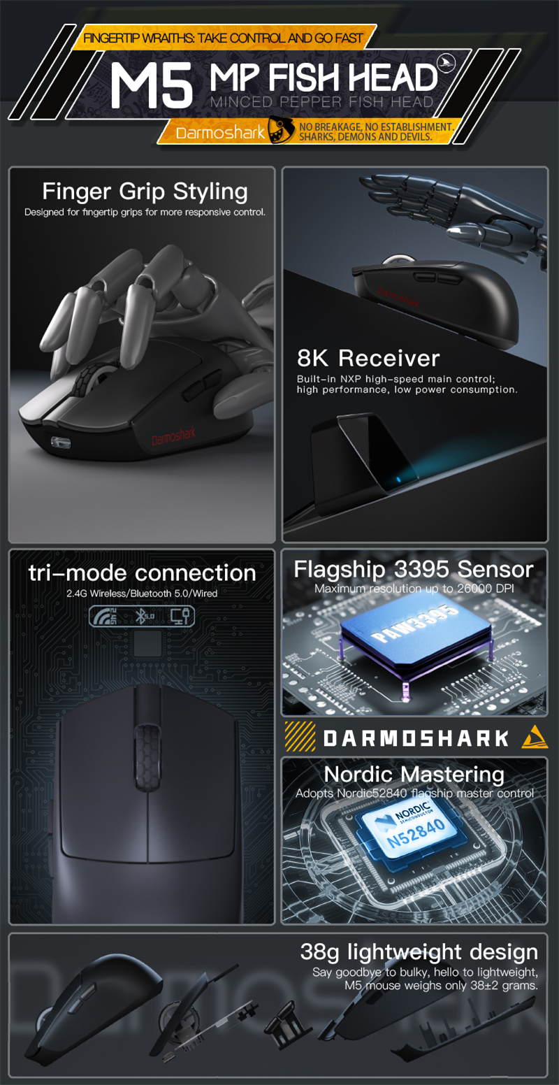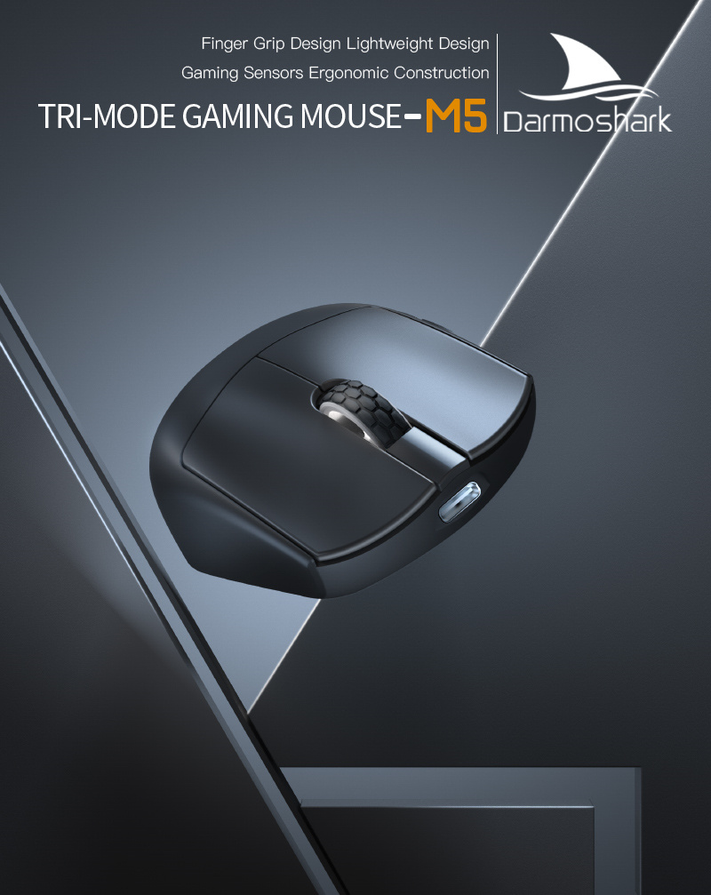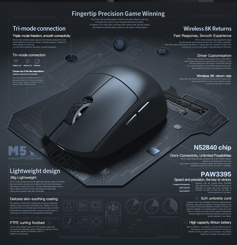 Darmoshark M5 Tri-mode Wireless Gaming Mouse PAW3395 Sensor Nordic N52840 26000DPI for Laptop PC 2.4G/bluetooth 5.0/Wired E-Sports Game Mice Support 8KHz Return 38g Lightweight Color Black