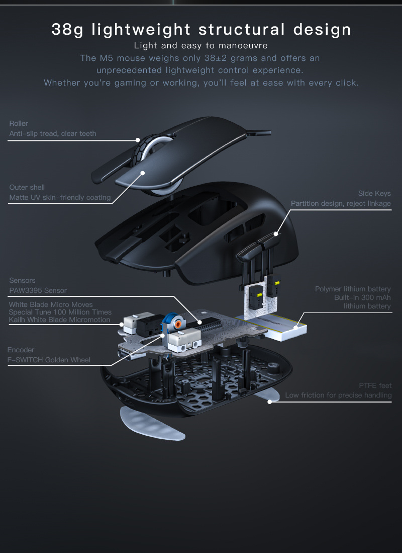 3. Lightweight Design: Weighing only 38 grams, it’s designed for comfort and long, uninterrupted gaming sessions.