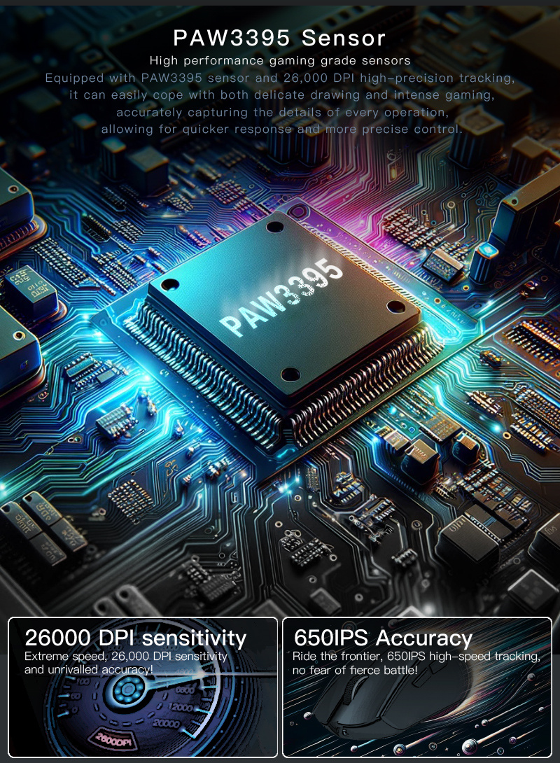 1. Advanced PAW3395 Sensor: Offers precision tracking with up to 26,000 DPI for an unparalleled gaming experience.