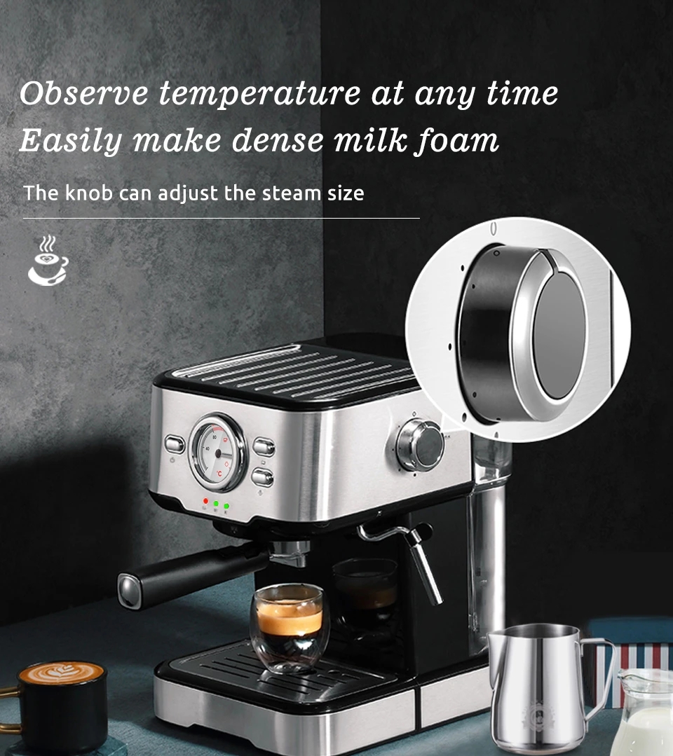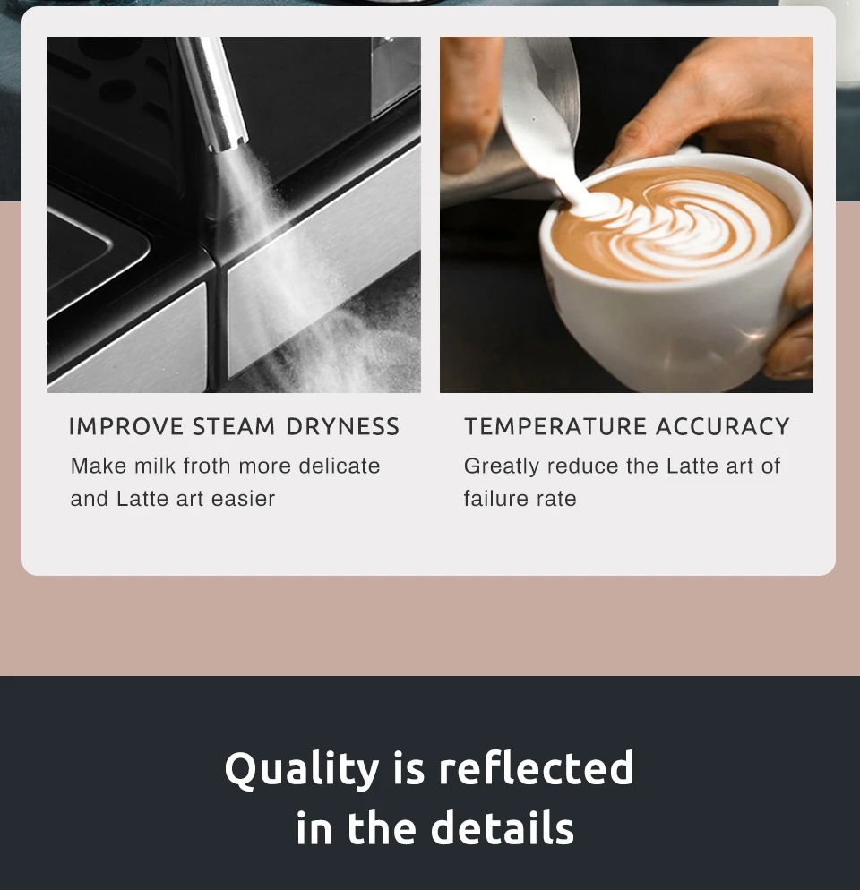 Easily Make Dense Milk FoamThe knob can adjust the steam size and improve steam dryness to make milk froth more delicate and latte art easier. The high-temperature accuracy can greatly reduce the latte art of failure rate.