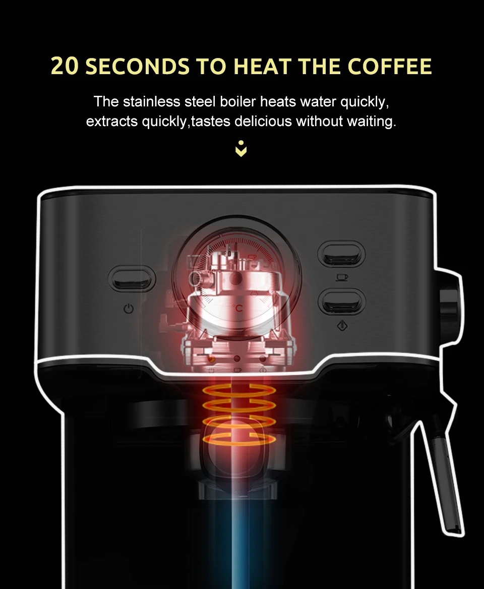 20 Seconds to HeatThe aluminum thermoblock boiler heats the water quickly, extracts quickly, and tastes delicious without waiting.