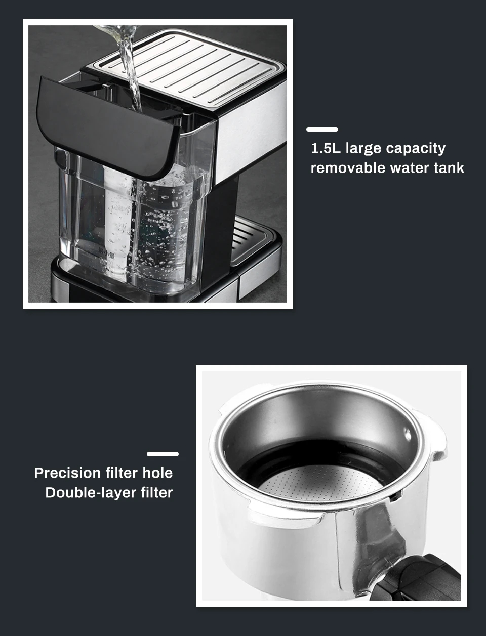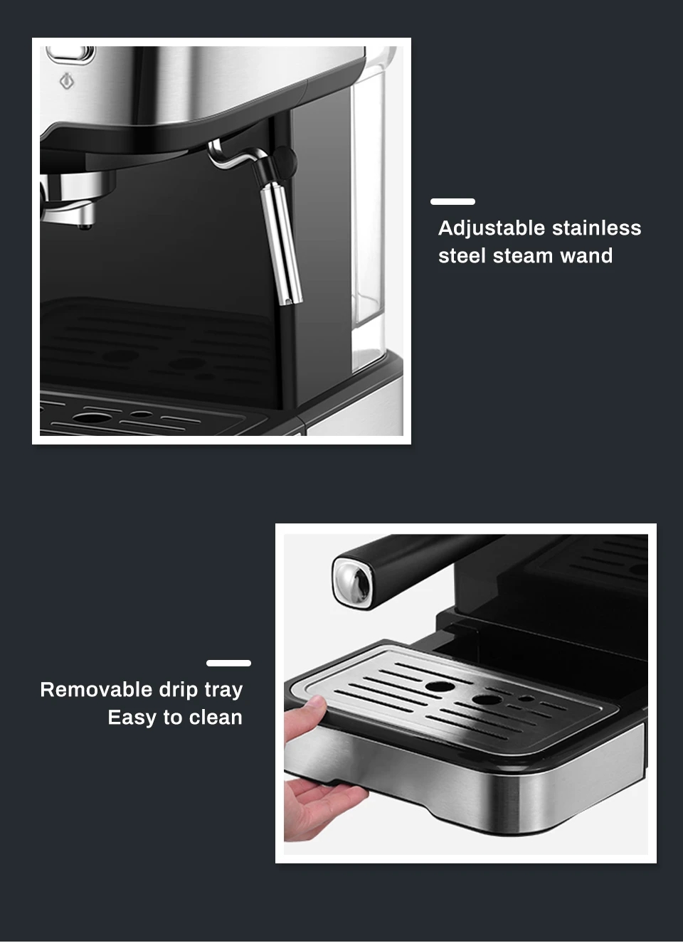 More FeaturesIt has an entry-level flat-bottom funnel for easily making the taste of the cafe.With precision filter holes, adjustable stainless steel steam wand, removable drip tray, and auto shut-off function, this coffee machine is easy to clean, convenient, and energy-saving.
