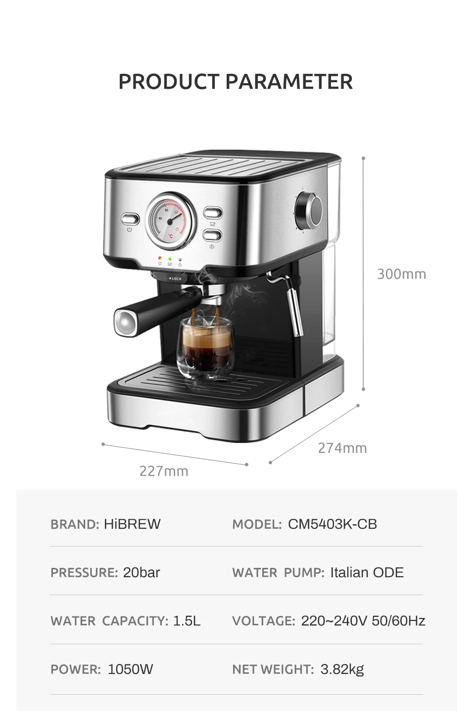 Specification | Brand: HiBREW Model: H5Pressure: 20barWater Capacity: 1.5LPower: 1050WVoltage: 220-240V, 50/60HzWater Pump: Italian ODEFilter Diameter: 51mmOperation: Semi-automatic with steam tubeHeating Element: ThermoblockPreheat Time: 43sWay of Making Espresso: Ground coffeeAuto Shut Off: YesSmall Cup/Tall Cup Option: NoHousing Material: Brushed stainless steel |