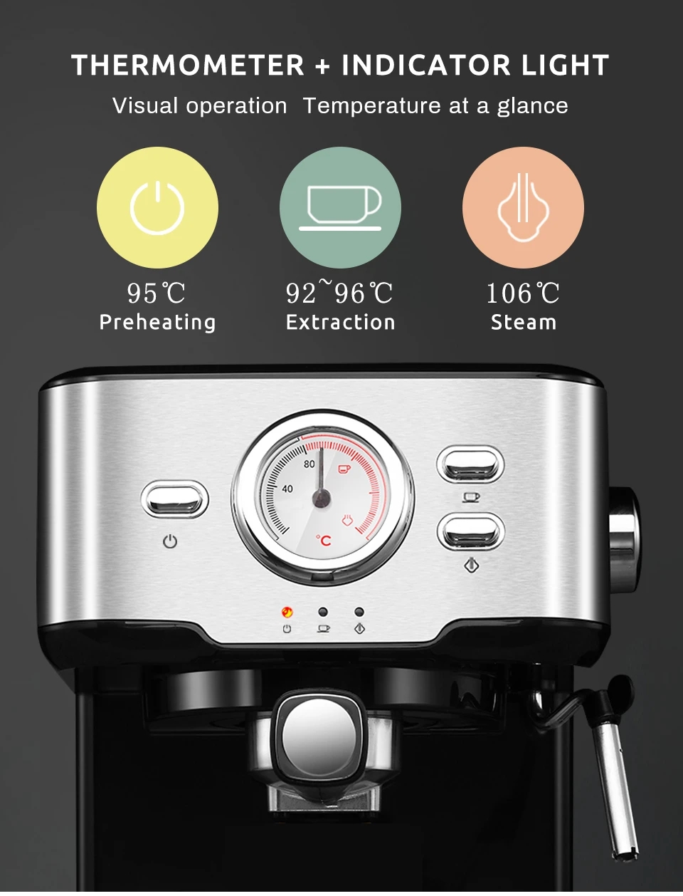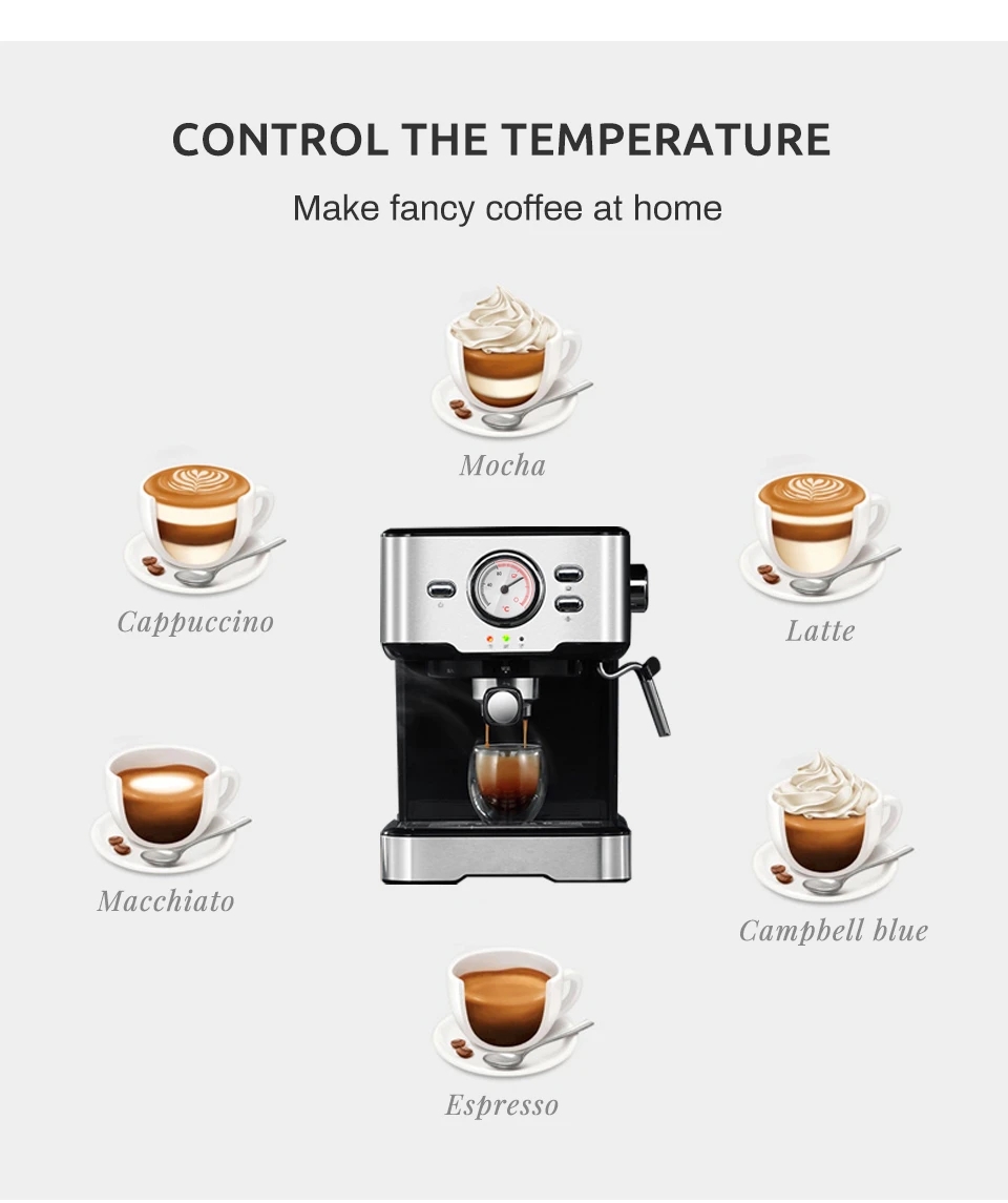 Clear Temperature DisplayThere is a big temperature display dial on the machine and indicator lights, which enables you to observe temperature at any time and make many kinds of coffee, such as mocha, cappuccino, macchiato, espresso, latte, and Campbell blue.