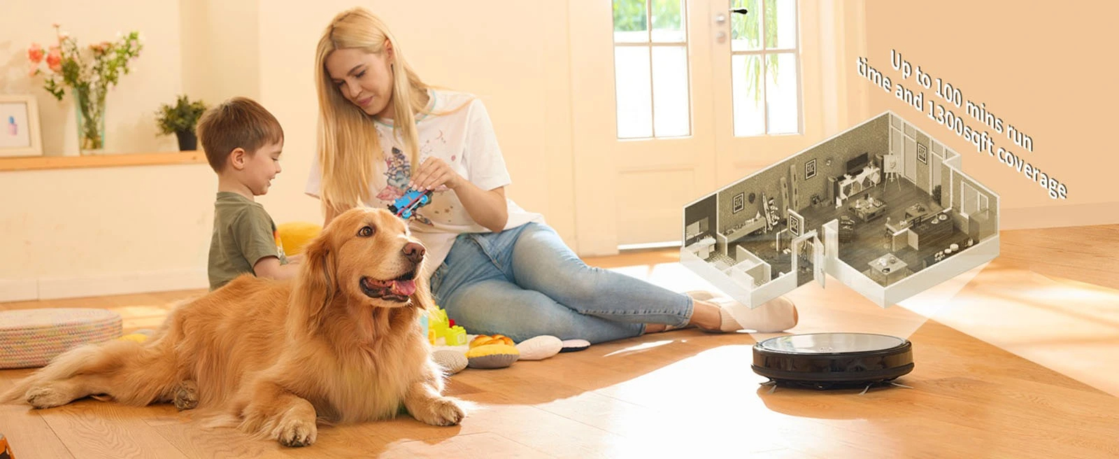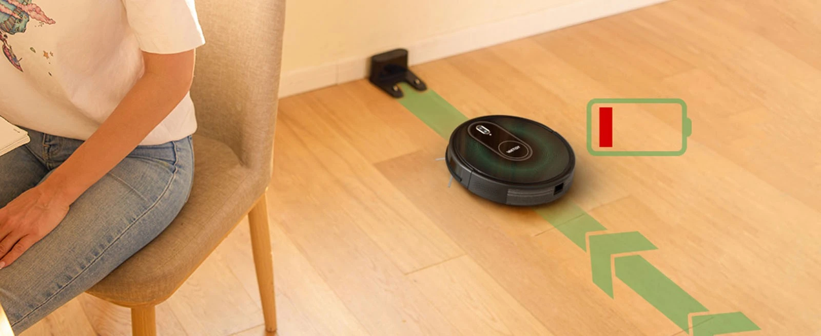[Long-Run Time & Automatically Recharge] Li-ion battery with 2500mAh capacity offering up to 100 minutes cleaning time without disruption, covering approximately 1300sqft coverage. The robot will head back to the charging dock when low in battery or finished cleaning task.