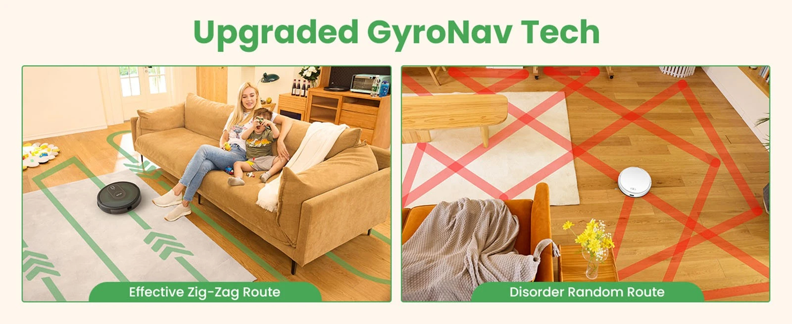 [Upgraded Navigation and Obstacle Avoidance] GyroNav Tech reduces the chance of bumping into obstacles thanks to the motion obstacle avoidance function. It embedded 3-floor sensors and 2 anti-collision sensors which intelligently identify stairs, and obstacles and avoid white walls.
