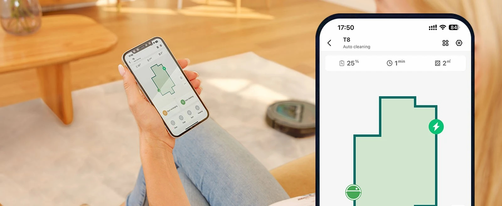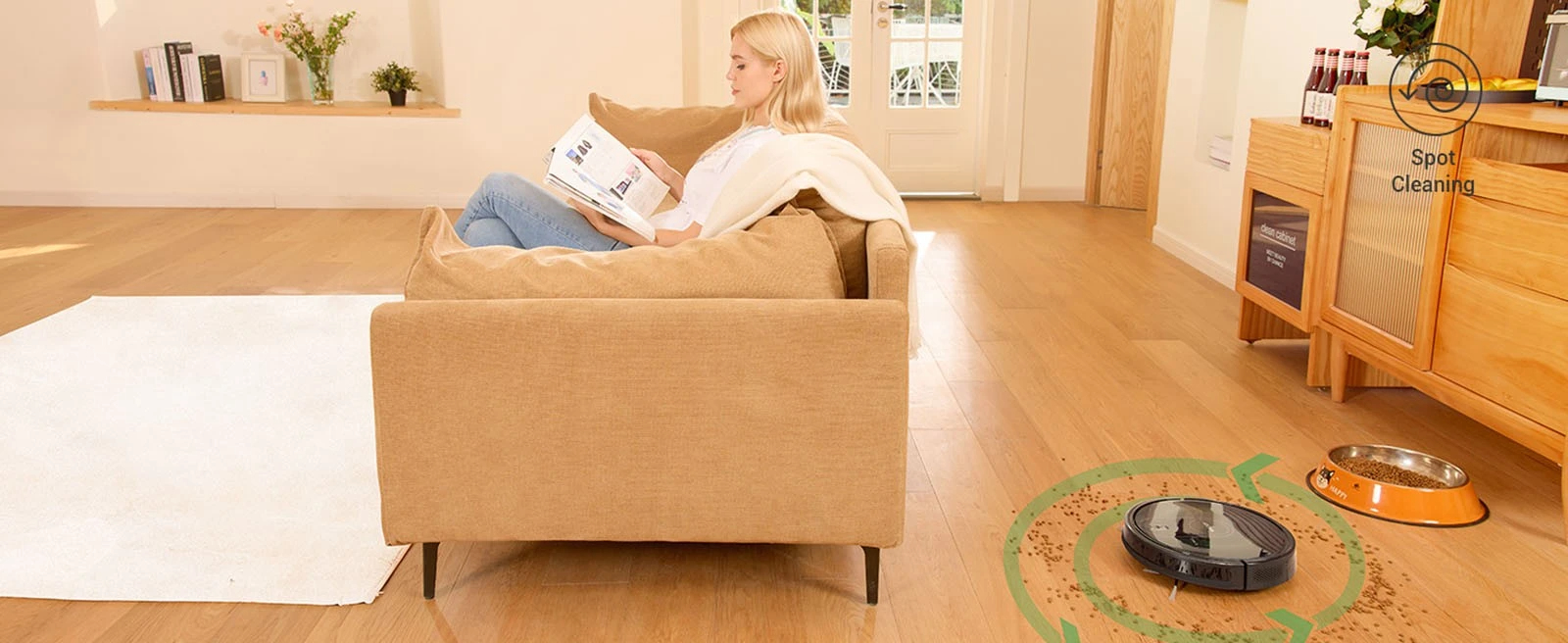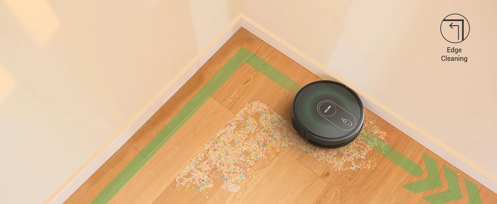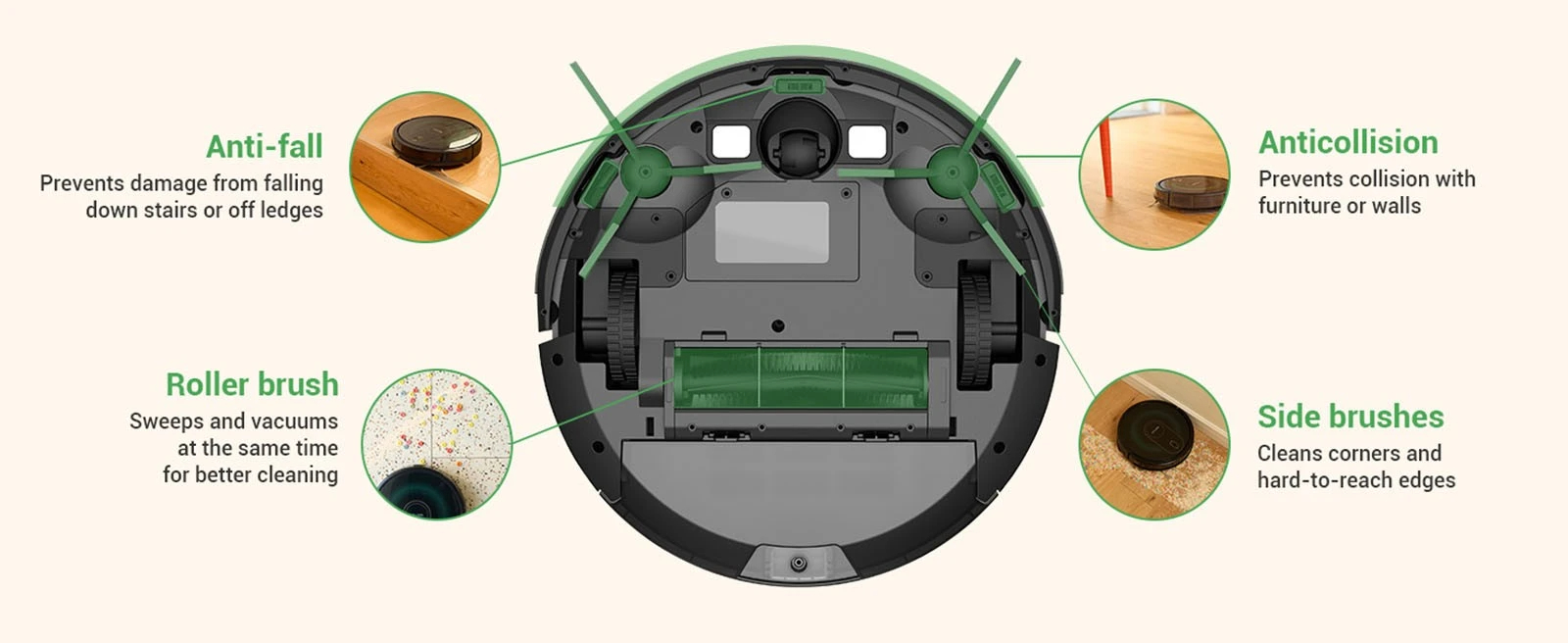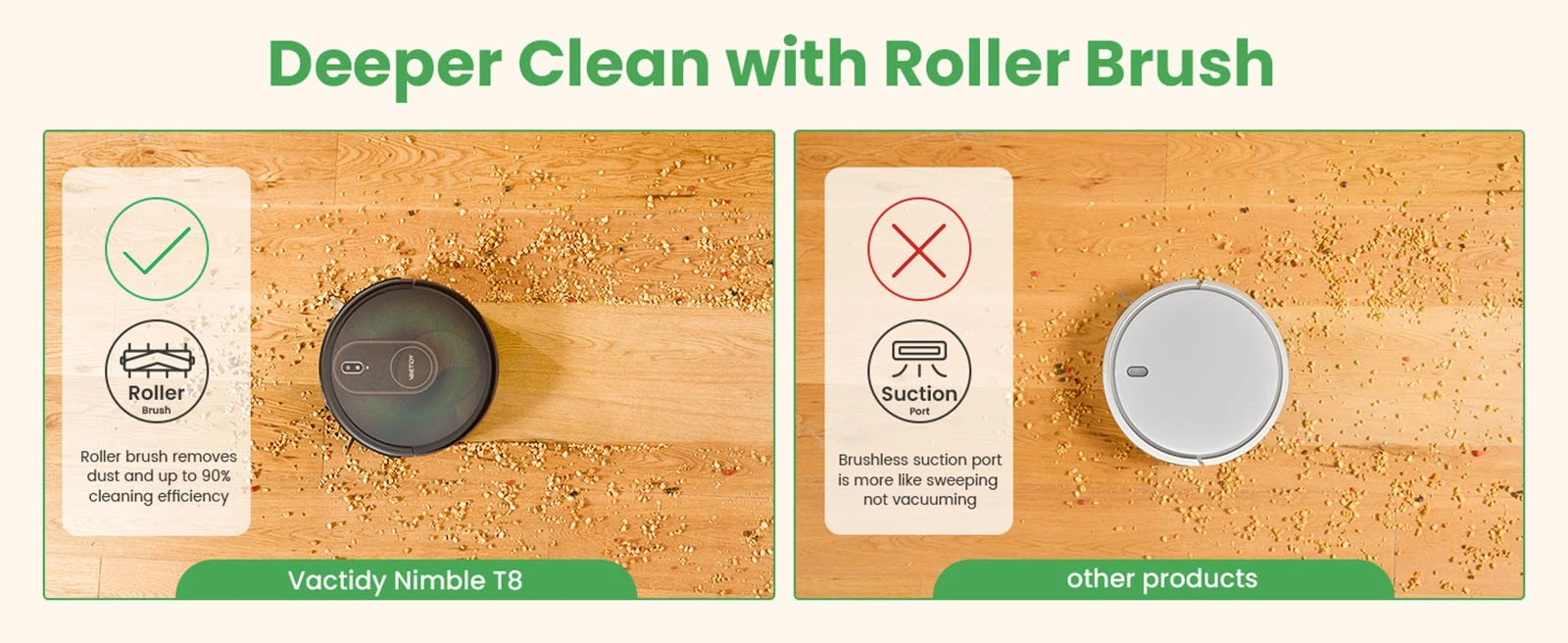 [Carpet Detection] Automatically boosts to Max mode when vacuuming on the carpet and can climb a height of less than 15°. Compared to the model with a suction port, the roller brush has a stronger grip on carpets, picking up deep hiding debris more effectively.
