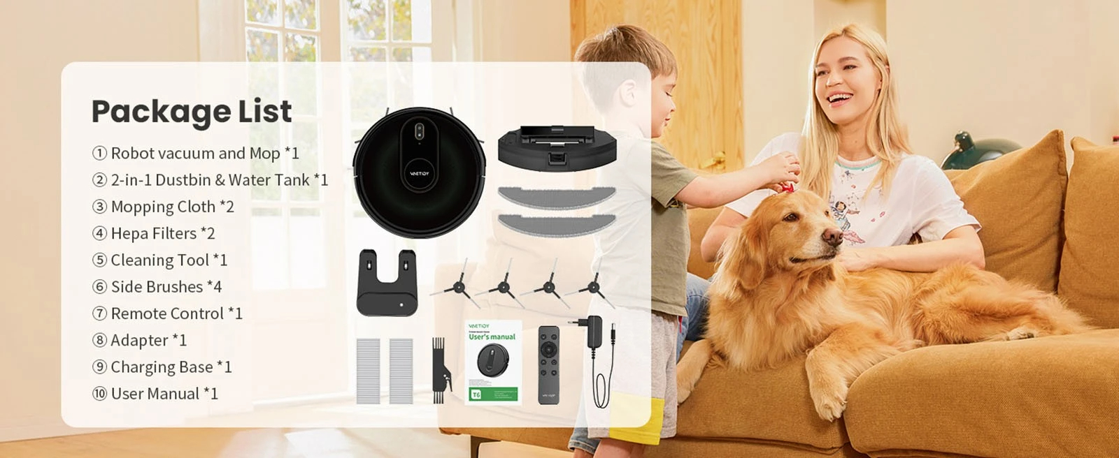 Package includes | 1 x Robot Vacuum 1 x 2 in 1 Dustbin & Water Tank2 x Mopping Cloth2 x Hepa Filters1 x Cleaning Tool4 x Side Brushes1 x Remote Control1 x Adapter1 x Charging Base1 x User Manual |