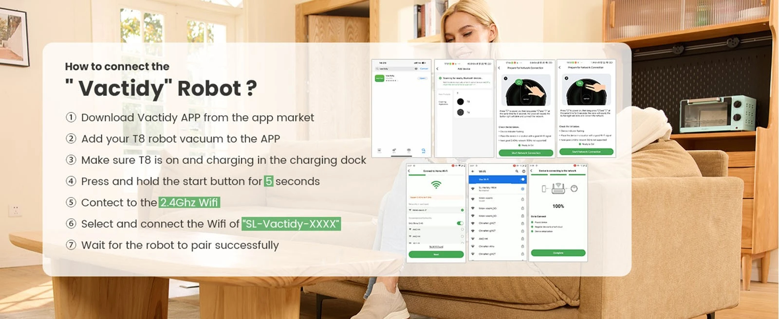 Description | Brand: Vactidy Type: Robot Vacuum CleanerModel: T8Color: BlackMax Suction: 3000PaMax Climbing Height: ≤15°Battery: 2500 mAhBrushes: Two side brushesFiltration System: HEPA FiltrationRuntime: Quite mode: 100 mins, Standard mode: 80 mins, Max mode: 60 minsRecharge Time: ≤ 6 hoursNoise: MAX: ≤ 70 dB, Standard: ≤ 65 dB, Quiet: ≤ 60 dBNavigation: Bouncing + 3 floor sensorsControl Method: Remote controller & App (2.4GHz Wifi)Floot Type: Hard floor and carpetClean Customization: Auto Cleaning; Room cleaning: Route planning; Edge cleaning; Spot cleaning; Schedule cleaning routinesVoice Assistant: Siri & Amazon Alexa & Google Home |
