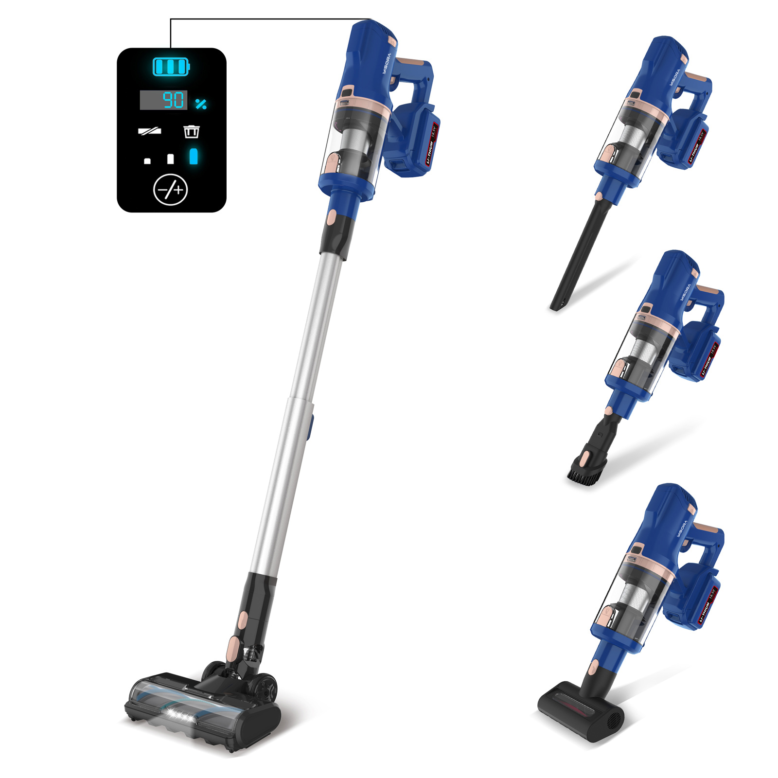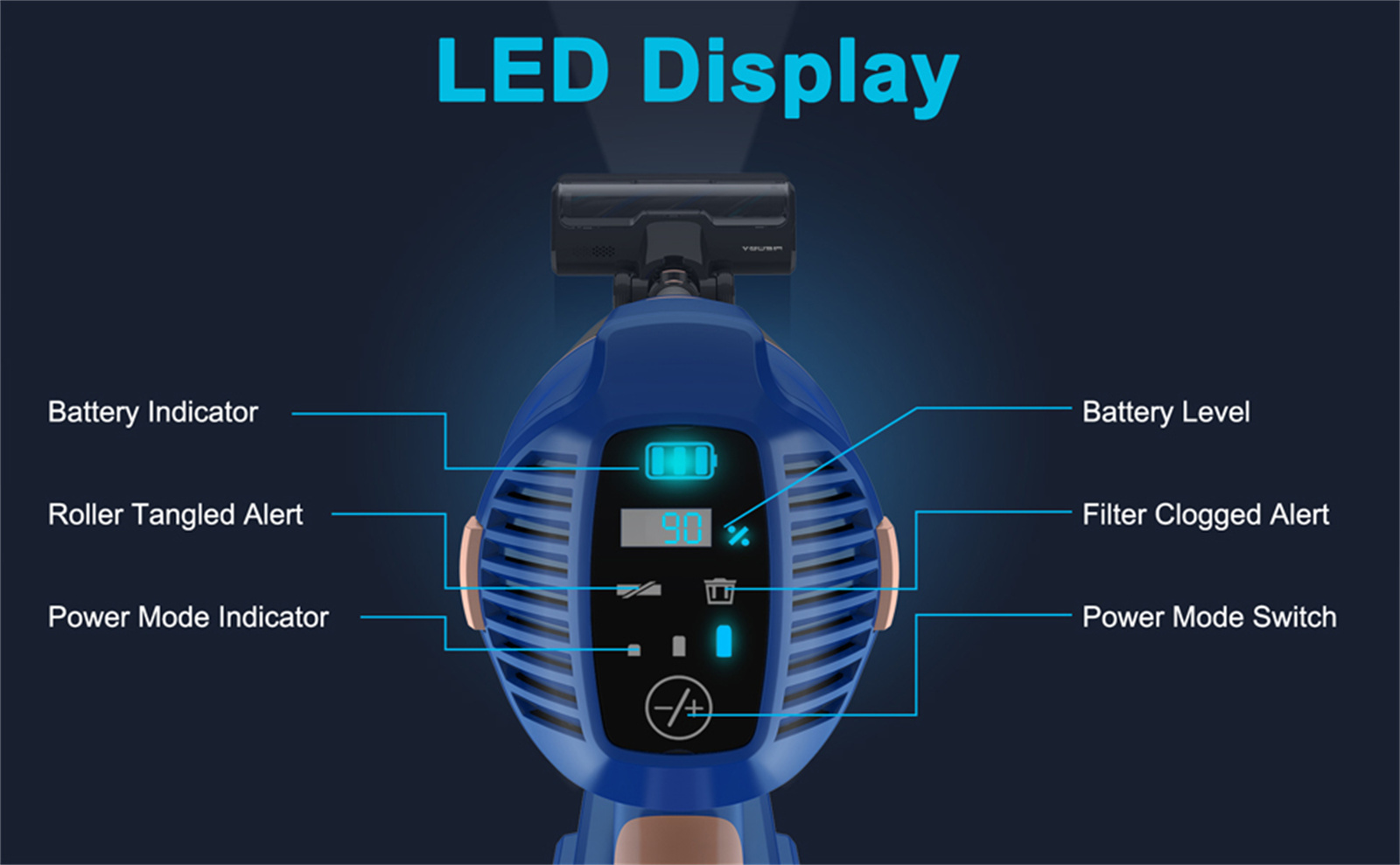 The large touch LED screen on the cordless stick vacuum displays indicators, including roller brush clog alert, filter clog alert, power mode indicator, and power mode switch, you can touch the switch to change power modes. This makes it effortless to adjust the vacuum power and know the status of your stick vacuum cleaner. This design is more convenient and trouble-free compared with traditional button operation.