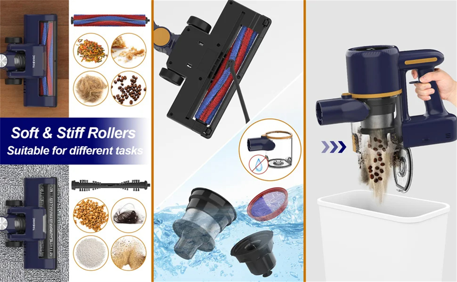 4.【LED Motorized Floor Brush】 : The floor brush of the battery-powered vacuum cleaner has a motorized impact roller and an LED headlight to track dust and dirt in dark corners. The vacuum cleaner adopts a V-shaped shaft and absorbs dust and dirt more efficiently than the conventional roller. The pre-installed soft roller is suitable for both hard floors and low-pile carpets; The rigid roller is ideal for cleaning low-pile carpets.