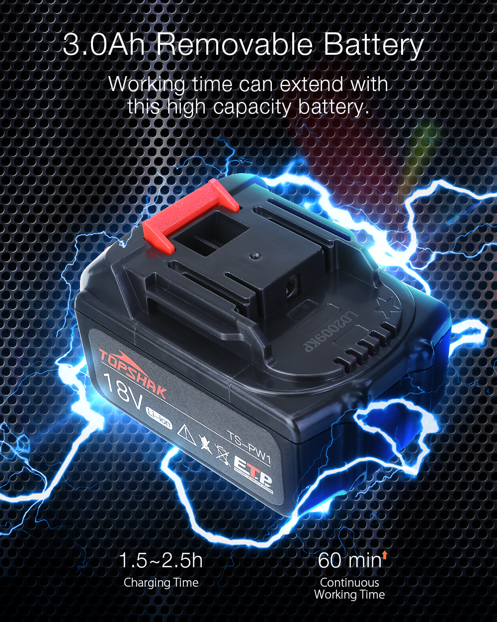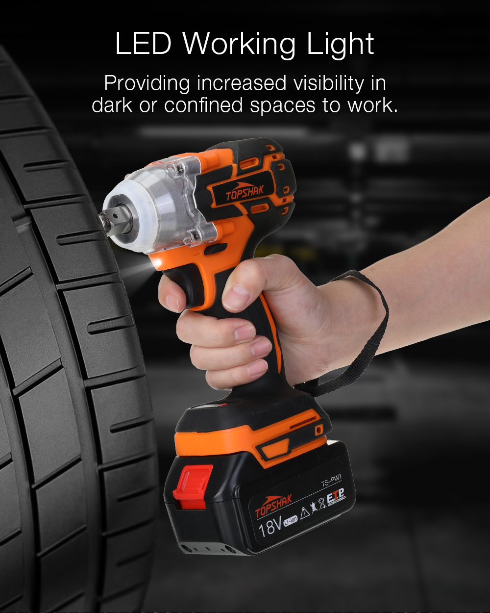 Specification:Brand: TopshakName: Topshak TS-PW1 Brushless Impact WrenchModel: TS-PW1 Voltage:DC 18VNo-load speed:0-3000rpmBattery capacity: 3.0 Ah(10X1500mah-Cell)Standard bolt:M10- -M20(3/8”-3/4”)High tensile bolt:M10-M16(3/8′-5/8′)Square drive bolt:12.7mm(1/2′)Charger input:AC 100-240VCharging time:1.5-2.5hSize: 246x148x70mmNet weight: 1.61kgPackage Contents:1x Topshak TS-PW1 Brushless Impact Wrench1x Battery1x EU Plug Charger 1X English Manual(click heare for a on line