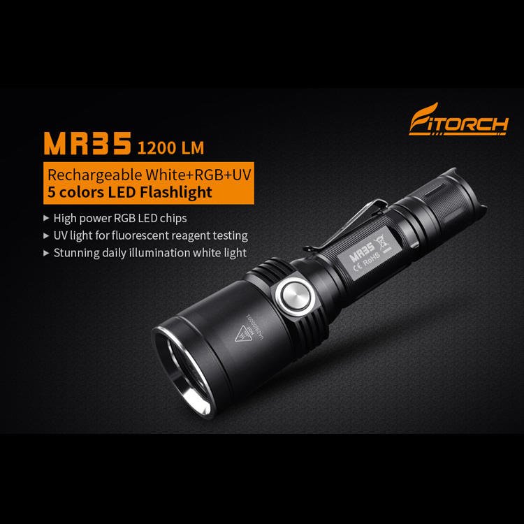 MR35 is a White+ RGB(high Power chip)+UV 5 separate LED chips combined, compact tactical flashlight with a stunning 1200 lumens maximum white output and emits high bright RGB light , It's ideal for map reading, hunting, riding, camping and outdoor activities.