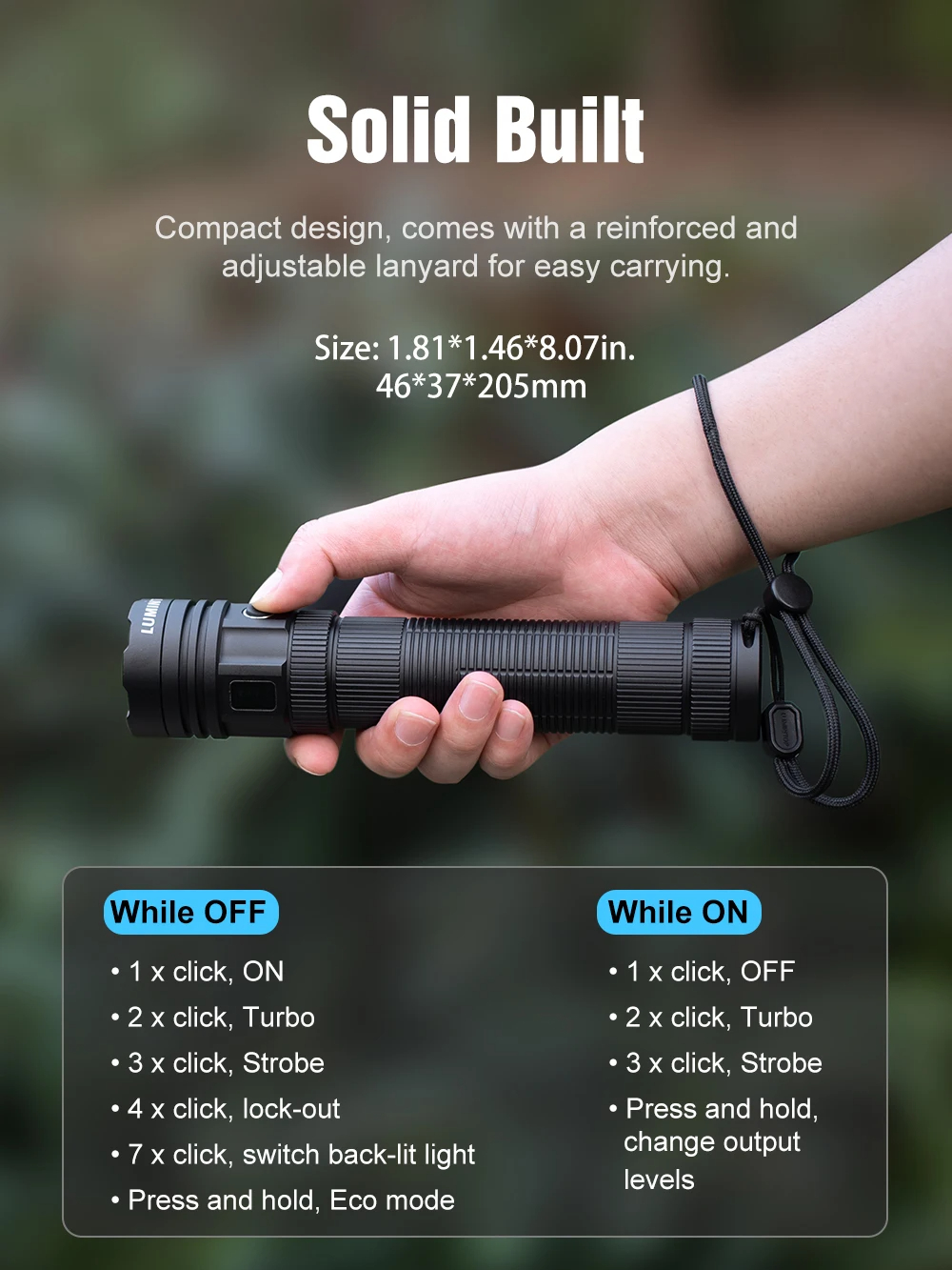 4.Strobe/SOS/Beacon: 3 clicks the switch to enter strobe, and another 3 clicks to change the blinking modes (Strobe-SOS-Beacon)