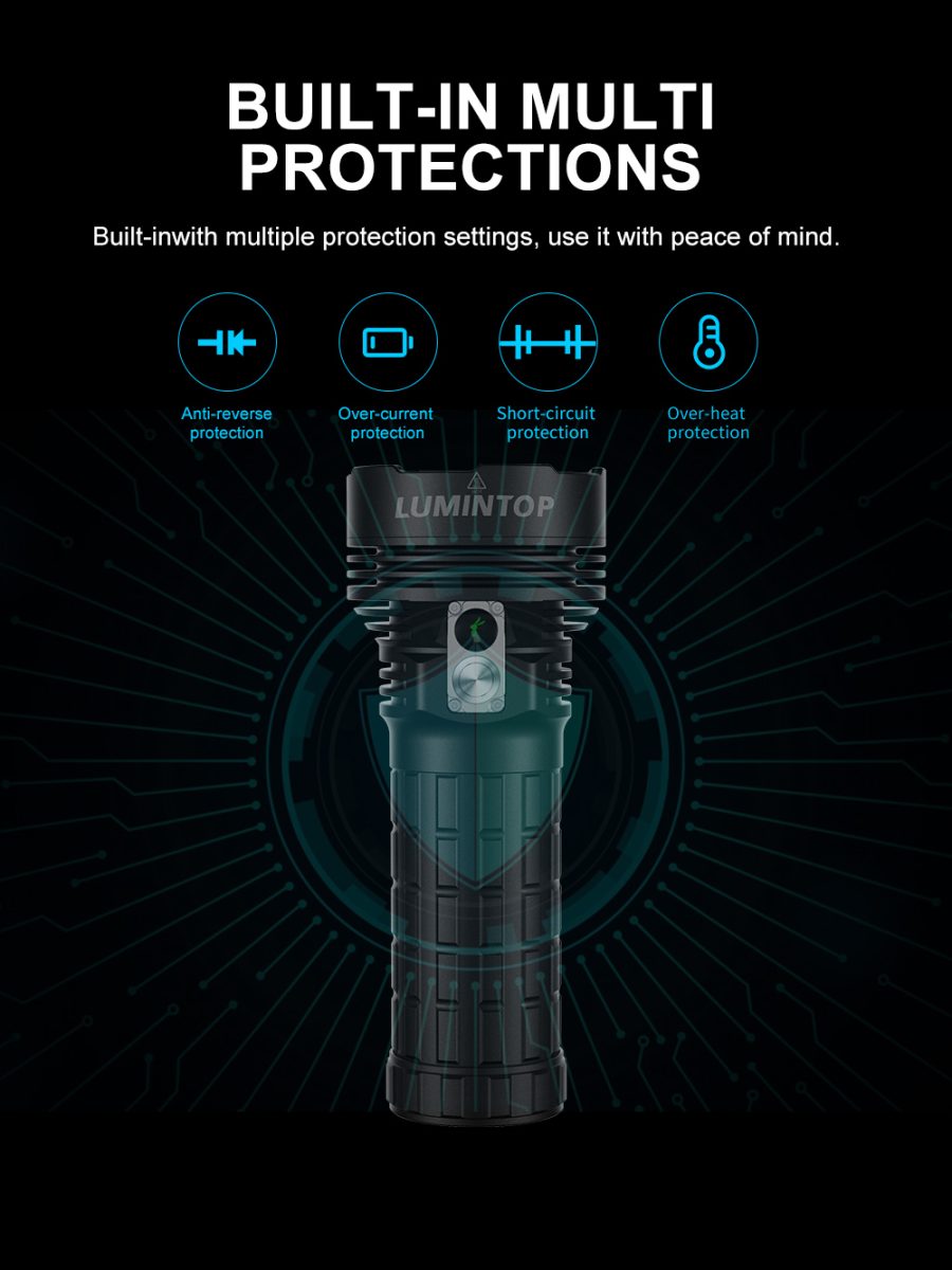 Mode Memory; TYPE C USB charging/discharging function; Over-discharge protection; Reverse protection, Over-heat protection; Low Voltage protection.