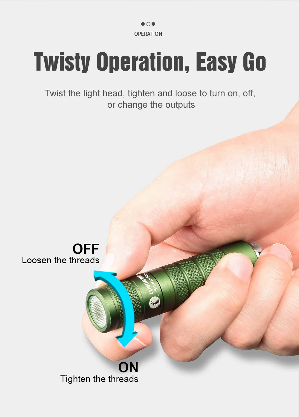 ON/OFF: Twist and tighten/loosen the light head to turn ON/OFF.