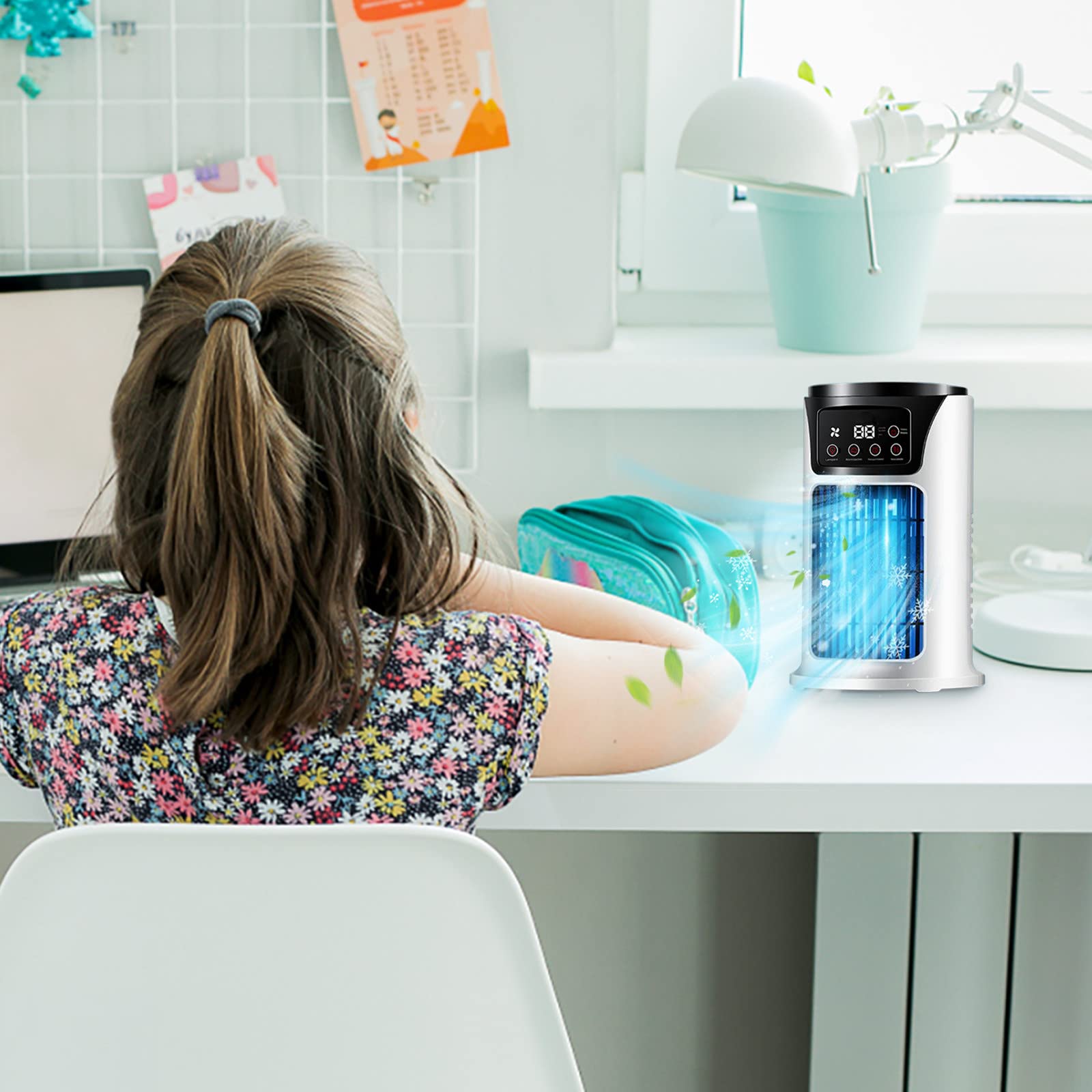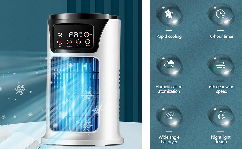 — Quiet: Low noise operation, tje electric personal mini air coolers on sale will not disturb your work and study; Adjustables air-outlet, multi angle blowing; Built in colorful breathing lights to create a good atmosphere; Timing function, time selectable, and the design is more thoughtful.
